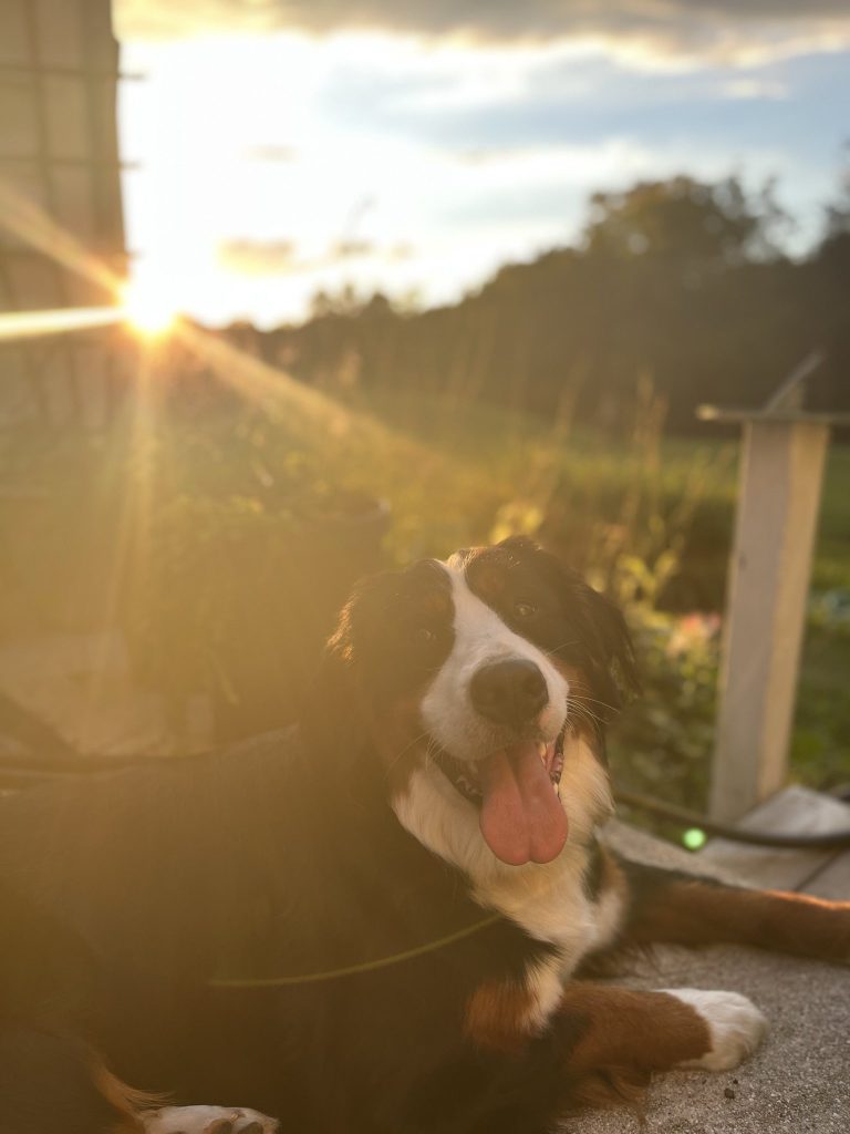Magnolia is a beautiful Bernese Mountain Dog, weighing around 75 pounds and registered with the AKC. While she’s not part of our breeding program, she’s absolutely a cherished member of our family and the heart of Ivy Meadows. Everywhere she goes, Magnolia spreads happiness. She’s never met a soul who didn’t instantly fall in love with her, and it’s common for people to remark that she’s the happiest-looking dog they’ve ever seen.