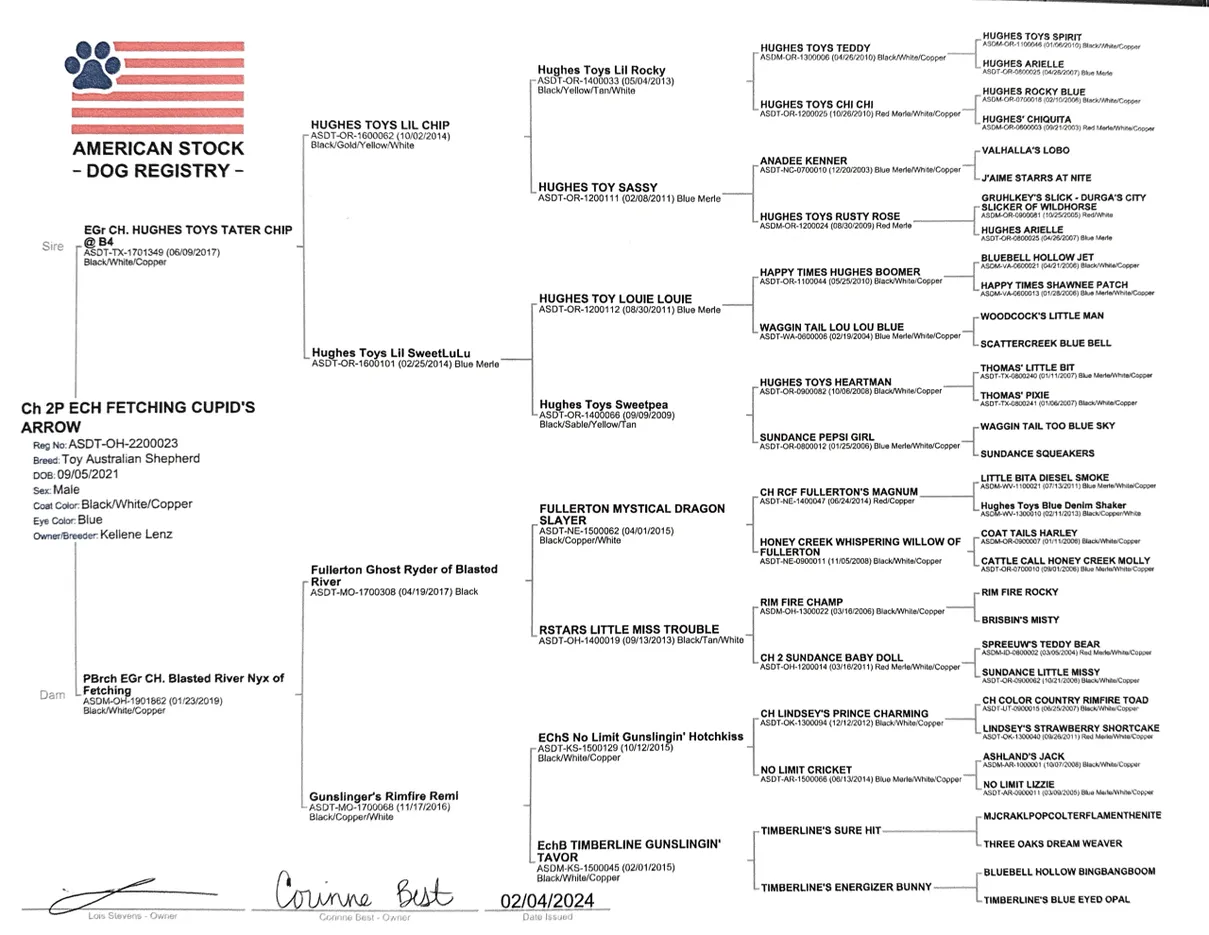 Ocean also comes from a wonderfully blended pedigree. Her dam comes from very recognized, proven lines with multiple champions behind her, while her sire is from foundation stock. Bringing those two worlds together—strong, established lines and an exceptional foundation dog—adds valuable genetic diversity while still preserving a consistent, well-structured Toy Aussie.