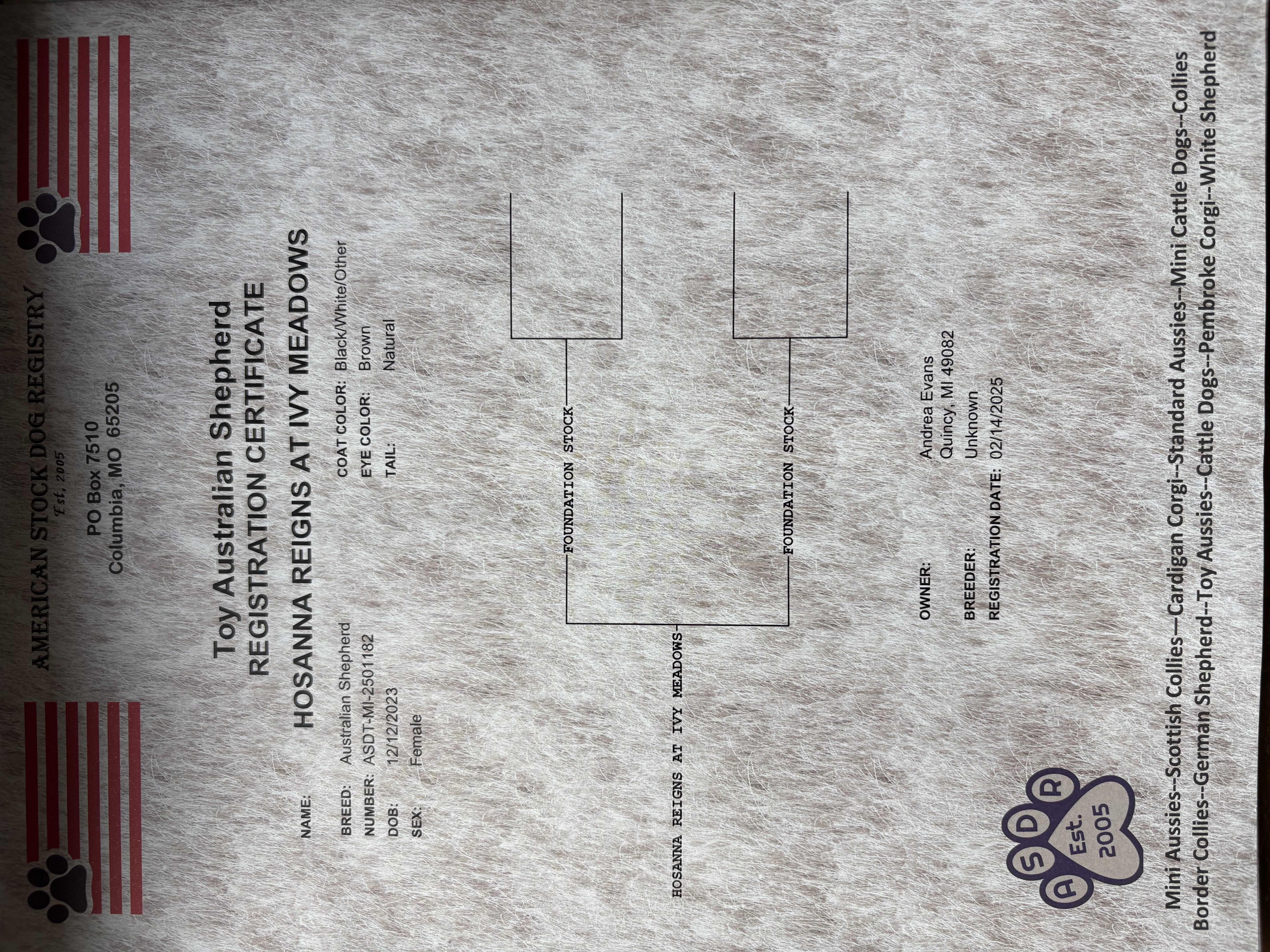 Her coat is beautifully sleek with a soft, medium-to-long length and noticeably minimal shedding compared to many Aussies, all while maintaining that classic, elegant Aussie coat. Zanny is hardship registered through ASDR from foundation stock, which brings valuable genetic diversity into our breeding program—something we greatly appreciate when working to preserve high-quality Toy Australian Shepherd lines.