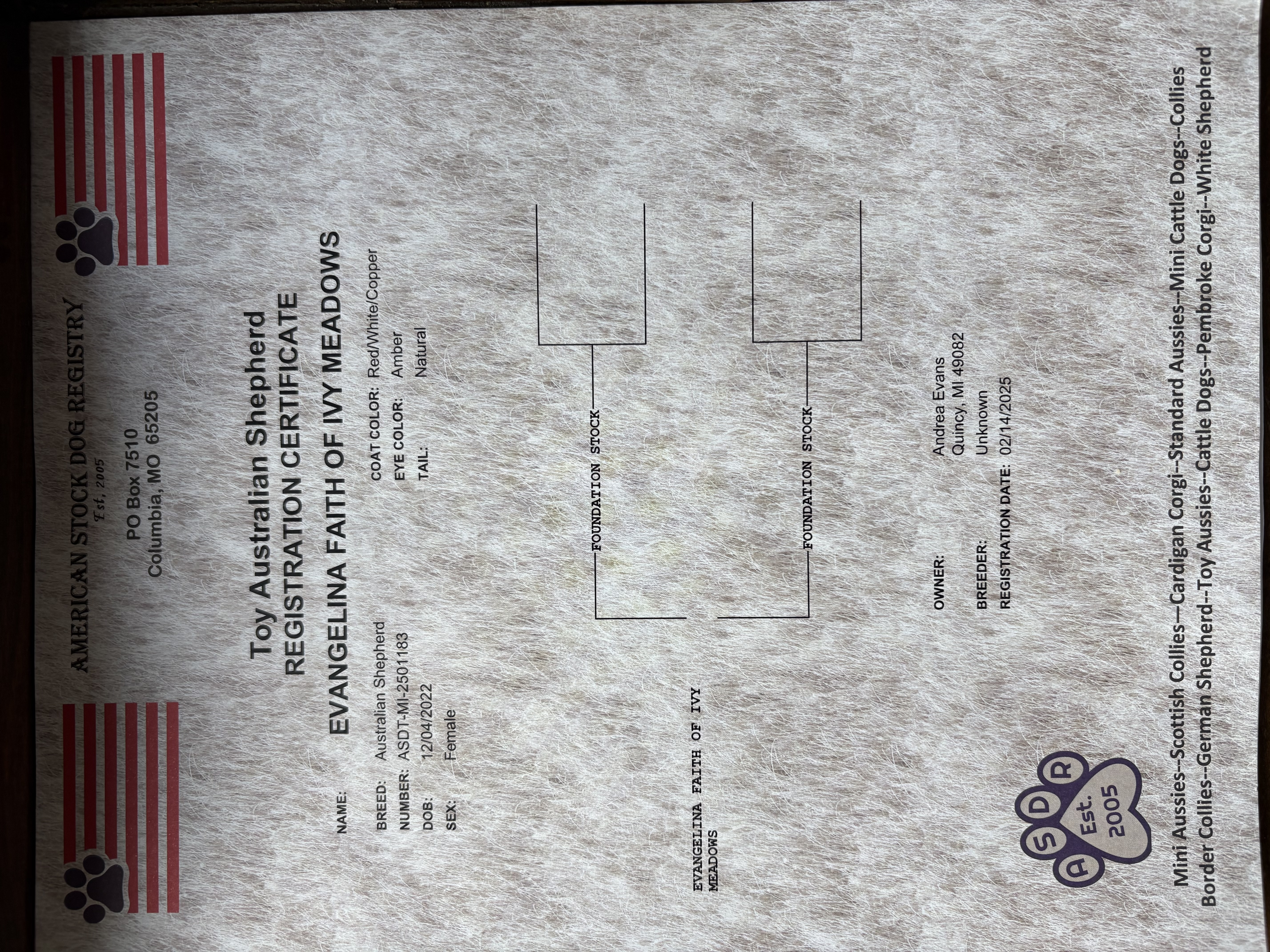 She is also a wonderful mother: gentle, attentive, patient, and nurturing in all the most important ways. Eva came to us at two years old from a breeder who was leaving the business, and she has been nothing short of a blessing. She is hardship registered from foundation stock, which I deeply value for the genetic diversity it brings to the breed—something I consider incredibly important in Toy Aussies.