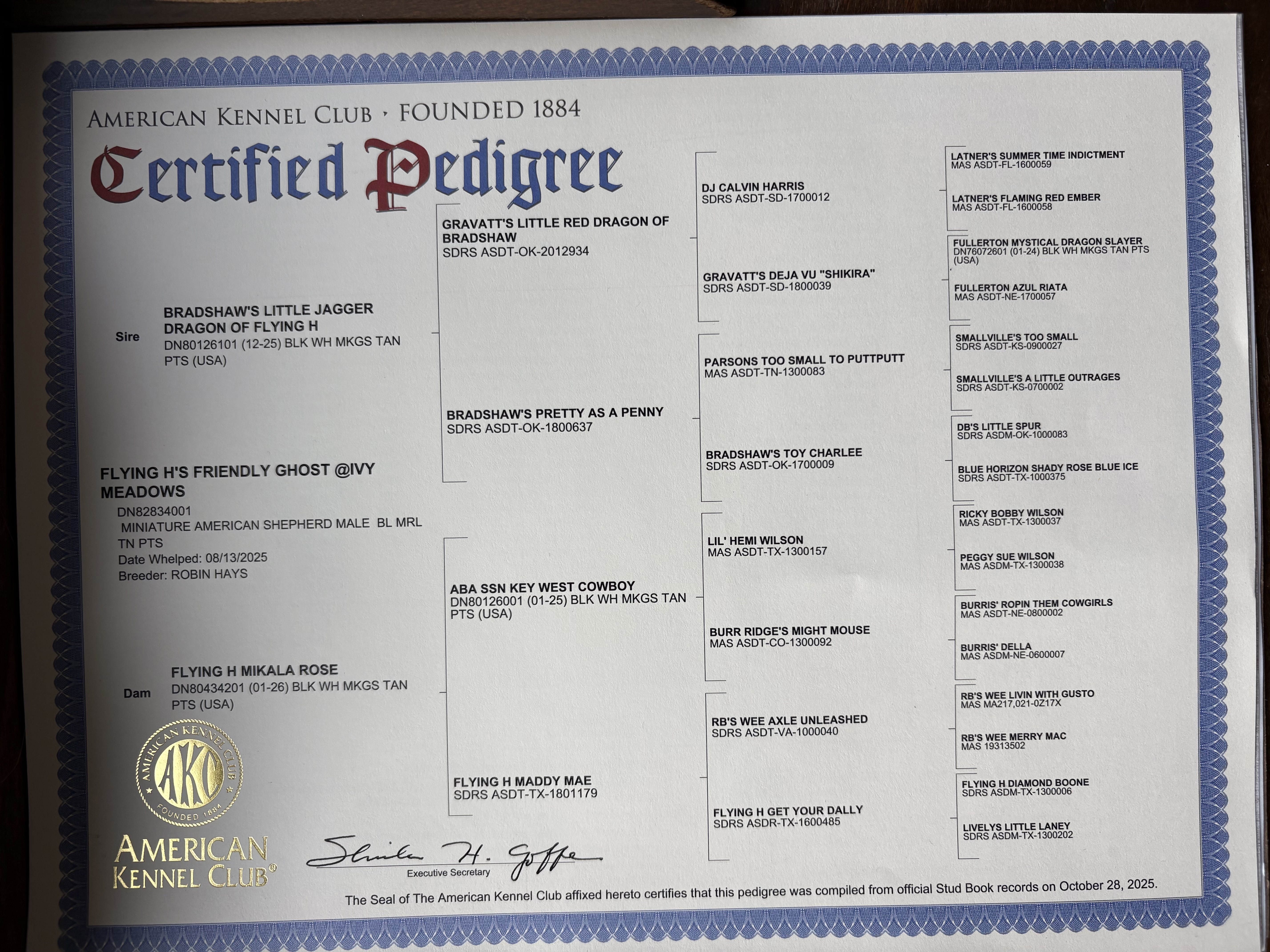 Casper comes from wonderful lineage. He is dual registered with the AKC and ASDR and is backed by strong conformation lines—including a champion parent, champion grandparents on his dam’s side, and lineage on his sires side tracing back to Fullerton’s Mystical Dragon Slayer, an international champion.